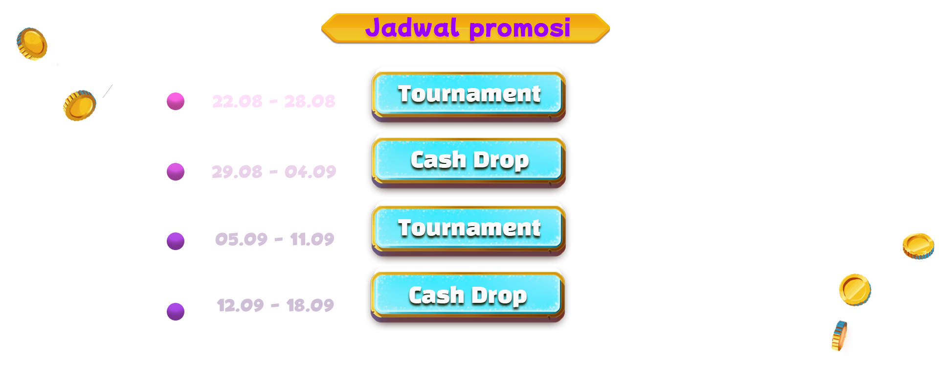 setiap pemain yang bertaruh di game NetEnt atau Red Tiger selama 29-Agustus ~ 04-Sep & 12-Sep ~ 18-Sep, kami akan mengirimkan total 4.000 hadiah secara acak. Dan jumlah hadiah akan didasarkan pada info hadiah Cash drop.